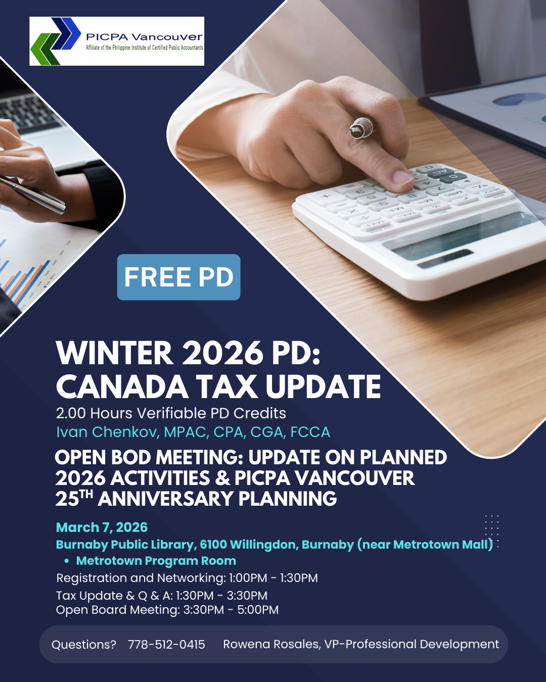 Following the seminar, we will hold an open BOD meeting to provide members with updates on our planned 2026 activities, including preparations for PICPA Vancouver's 25th anniversary. This is great opportunity to stay informed, share ideas, and let your voices be heard.